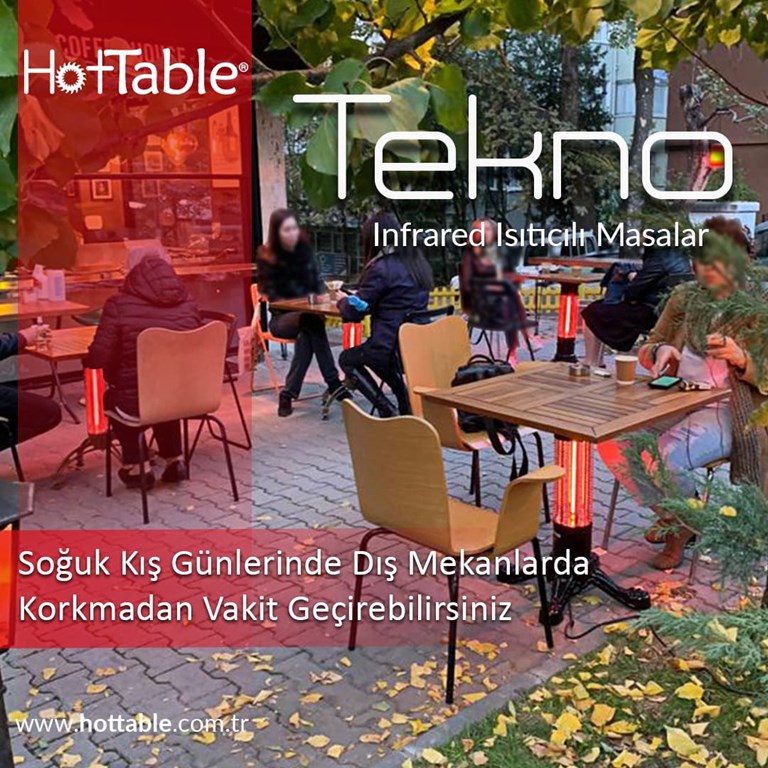 HotTable Tekno Isıtıcılı Masalar, açık alanlarda konforu en üst seviyeye taşıyan yenilikçi bir ısıtma çözümüdür. Restoran, kafe, otel, teras ve verandalar için özel olarak tasarlanan Tekno ısıtıcılı masalar, ısıyı doğrudan oturan kişiye ileterek geleneksel ısıtıcılara göre çok daha verimli, ekonomik ve homojen bir ısınma sağlar.